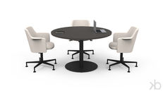 Workbench partnered with Cirque to provide 900mm diameter circular genie meeting tables. The tables are detailed with quarter cut oak veneered tops with a light wash finish and powder coated steel column bases. Tables are vertically cable managed inside the central column providing mains and USB power outlets plus data connections at table top level.